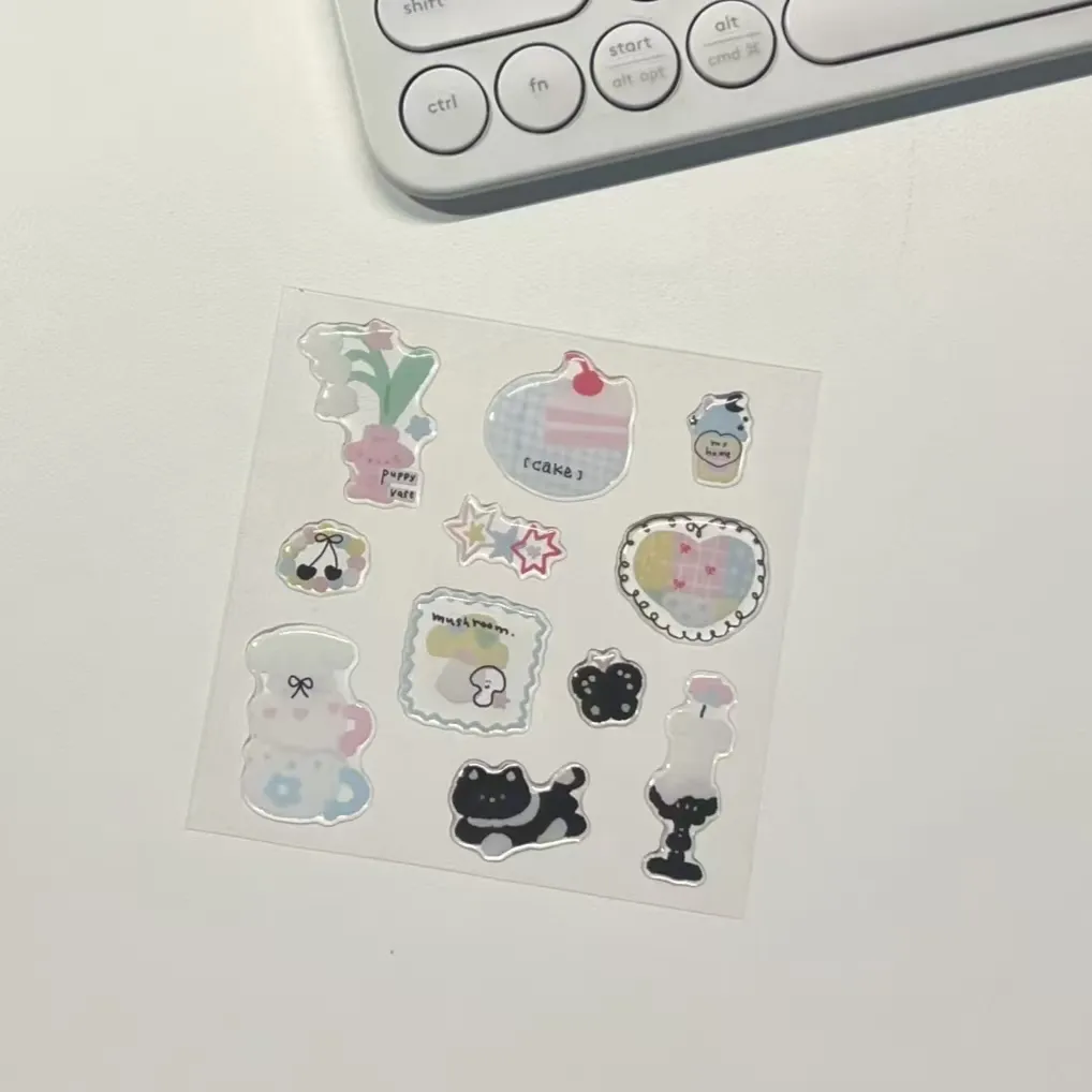3D karikatür epoksi reçine çıkartmaları için çevre dostu PVC/PP taban malzemeleri sunuyoruz. Epoksi reçine tabakasının kalınlığı 0,3 mm'den 1 mm'ye kadar özelleştirilebilir. Çıkartmalara daha fazla yaratıcılık katmak için parıltılı veya parlak efektleri de tercih edebilirsiniz. Duvar, plastik, metal ve kağıt gibi çeşitli yüzeylere yapışmaya uygun, standart güçlü yapıştırıcı ve kalıntı bırakmayan çıkarılabilir yapıştırıcı olmak üzere iki yapıştırıcı seçeneği sunuyoruz.