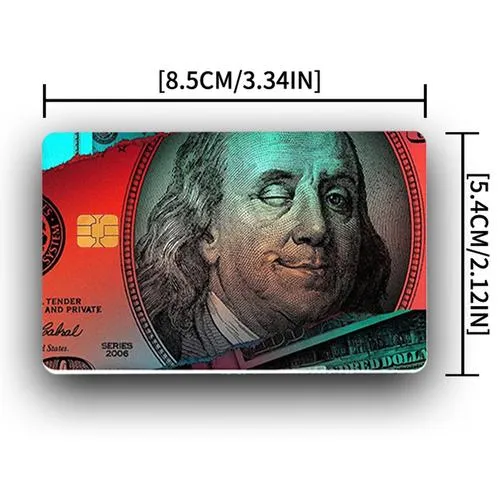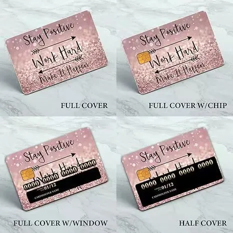 Kredi kartı çıkartmalarıTam kapak, yarım kapak, kart numarası veya çip için pencereli kapak ve mikroçip için önceden kesilmiş alan içeren kapak dahil olmak üzere çeşitli tarzlarda mevcuttur. Boyut genellikle yaklaşık 5,3*8,5 cm olan standart boyutlu kredi kartlarına uyacak şekilde tasarlanmıştır.