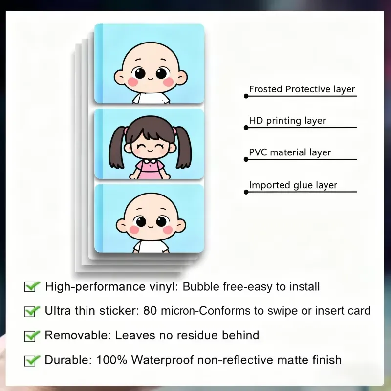 Kredi kartı kapak çıkartmalarıKredi kartlarının yüzeyine uygulanmak üzere tasarlanmış dekoratif ve koruyucu çıkartmalardır. Ayrıca banka kartları, ulaşım kartları ve anahtar kartları gibi benzer boyuttaki diğer kartlar için de uygundurlar.