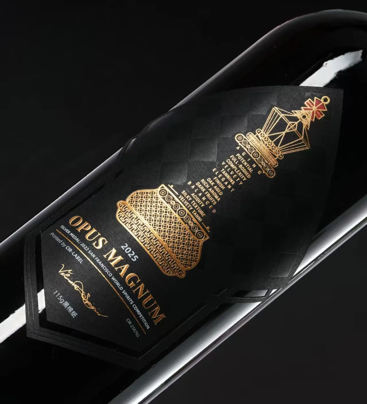 Bu brendişarap etiketiyayılan bir ışıltı yaratmak için alüminyum folyonun parlaklığını kullanır. Odak noktası olan marka adı ve ürün adı ön plana çıkarılır. Etiketin tamamı damarlı, mat bir yüzeye sahiptir ve mat efekti, etiketin lüks ve gelişmişlik duygusunu artırır. Bu teknikler özellikle üst düzey pazarı hedefleyen şarap markaları için önemlidir.